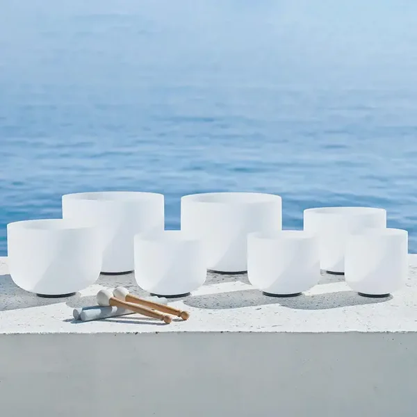Crafted from 99.99% pure quartz crystal, this frosted crystal singing bowl set offers powerful sound resonance and a radiant, translucent white finish. Each bowl in this 7-piece set is carefully tuned to align with the chakra system, offering a harmonious range of notes: